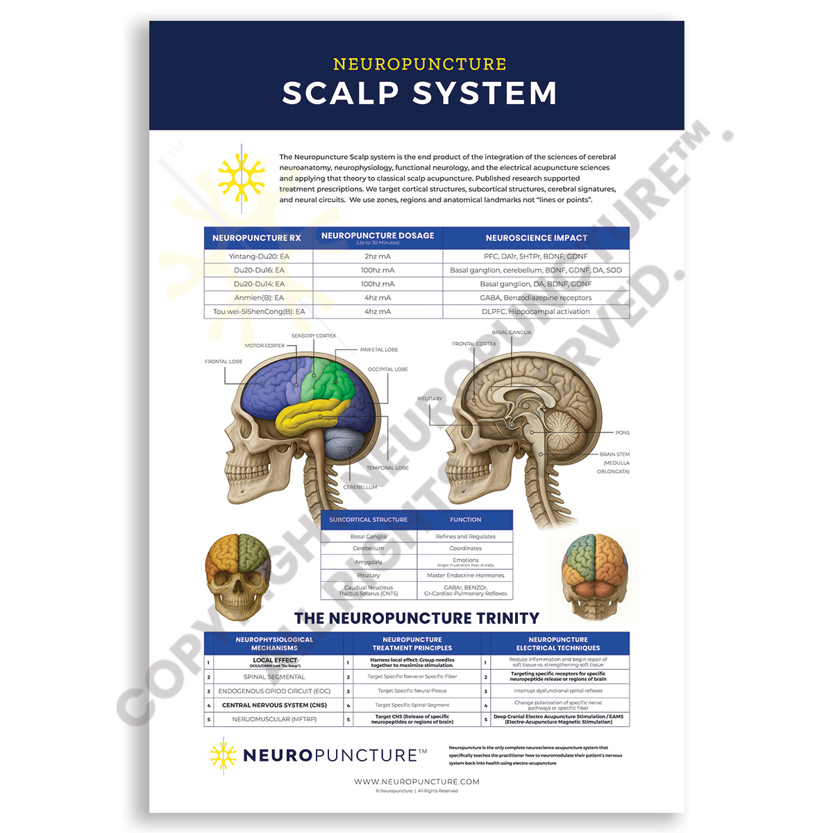 This 2ft by 3ft Neuropuncture™ Scalp System wall chart is an excellent tool for patient education specifically on the Neuropuncture Scalp System. The chart includes several Neuropuncture™ Scalp treatment prescriptions (Rx), along with clearly defined treatment dosage parameters and their associated neuroscience impact, making it a practical reference for use in clinical settings.